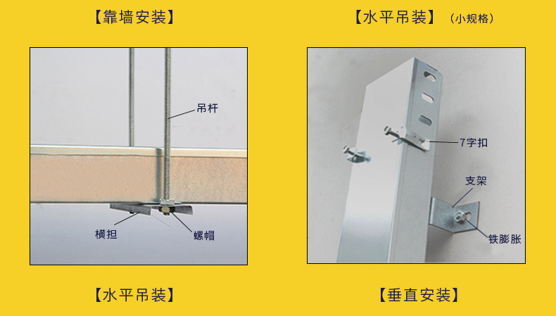 槽式橋架安裝方法:靠墻安裝 、水平吊裝(小規格)、水平吊裝、垂直安裝