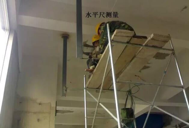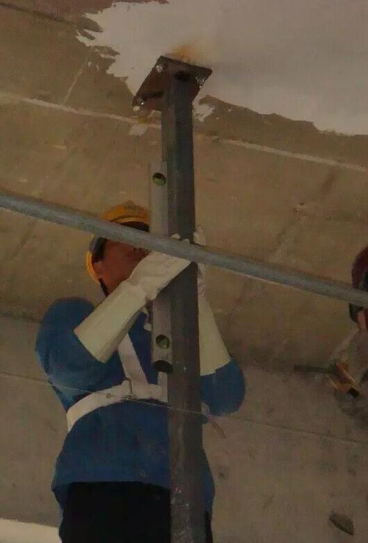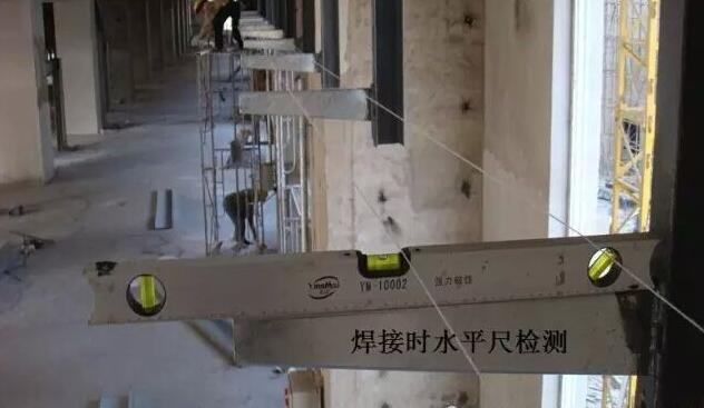 4、根據(jù)土建所給標高,確定兩端立柱焊接位置,立柱焊接在墊板上,焊接前使用水平尺進行檢測以保證立柱垂直度。