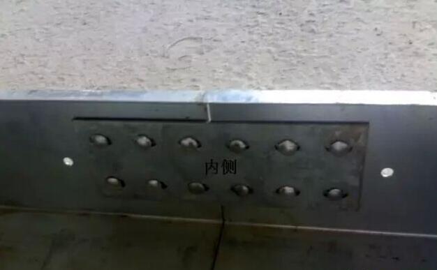 7、立柱與墊板焊接時,要對立柱的內(nèi)外兩側(cè)施焊,焊縫均勻飽滿。焊接時一般外側(cè)滿焊,內(nèi)側(cè)分段焊接,槽鋼拐角處,兩側(cè)各留10mm不焊接。