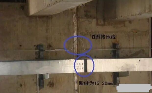 4、直線段金屬電纜橋架長度超過30m,玻璃鋼制電纜橋架長度超過15m時應設(shè)有伸縮節(jié),電纜橋接跨越建筑物變形縫處應斷開(斷縫15-20mm),同時跨接地線做成Ω型。