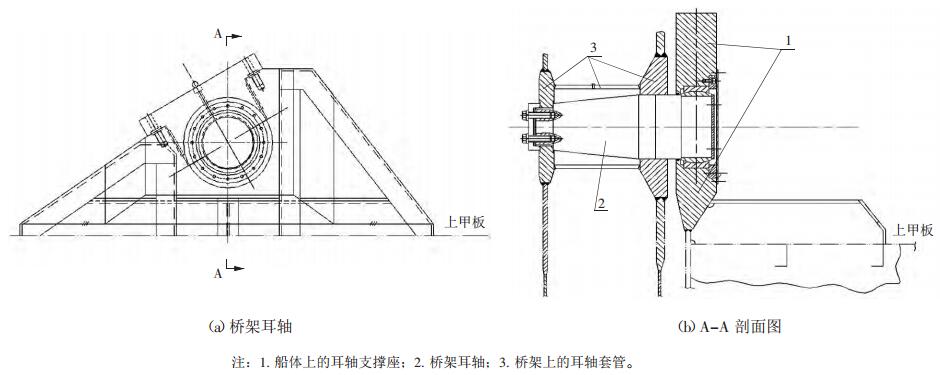 橋架耳軸是橋架與船體連接的關鍵部件,其一端承載橋架的重量等,另一端則坐落在船體的耳軸支撐座上。早期的小型絞吸挖泥船上的小型橋架,與船體采取相對簡單的鉸接形式。